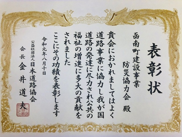 2019年度”道路功労者”に選ばれ表彰を受けました。