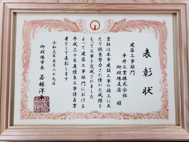 2019年5月29日、御殿場市民会館にて令和元年度御殿場市優良工事表彰が行われました。